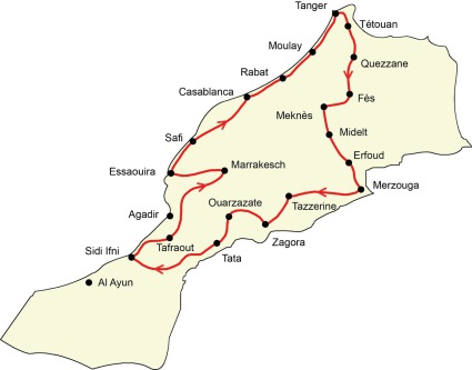 Weiter geht es über gewundene Bergstraßen, vorbei an Zedernwäldern, durch schattige Flusstäler zu den Dünen des nördlichen Randes der Sahara. Wir entdecken die hochaufragenden Kasbahs der Berberdörfer und fahren entlang des zerklüfteten Gebirgsmassivs des Hohen Atlas bis zum Atlantik.