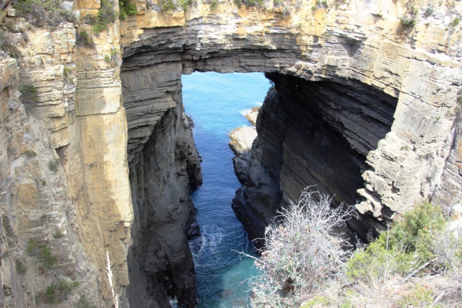 Danach wandern wir bei schönstem Sommerwetter im Tasman Nationalpark vom Eaglehawk Neck bis zur Waterfall Bay mit spektakulären Ausblicken auf die schroffe Steilküste, wo die von der Brandung umtosten Felsbrücken Tasman Arch und Devils Kitchen ins Meer hinausragen. Ein unvergesslich schöner Tag!