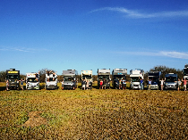 Lange Fahrtage sind zu bewältigen: 380 km bis Prieska und am nächsten Tag 430 km bis Graaff-Reinet. Auf den leeren, schnurgeraden Straßen werden Geschwindigkeitsrekorde aufgestellt und neue Automodelle getestet. Alle 10 km - wenn überhaupt - begegnet uns ein Auto. Da werden wir uns in Deutschland wieder ganz schön umstellen müssen! In Prieska schaffen wir es endlich, all unsere WoMos zu einem „Gruppenfoto“ aufzustellen, bevor es zu spät ist. Nur noch wenige Tage, und unsere Afrikatour ist zu Ende …